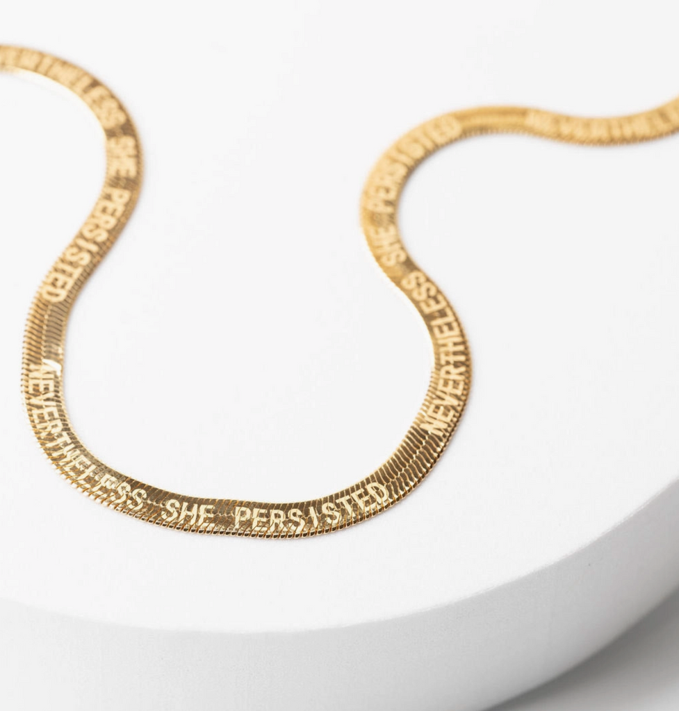 * A trendy, Herringbone chain plated in gold * 16" length with a 1.5" extender * Chain engraved with NEVERTHELESS SHE PERSISTED around the length of the chain
