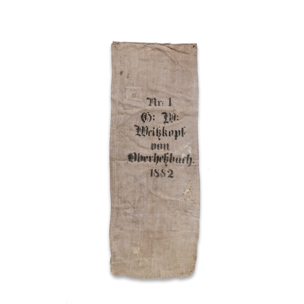 This antique German grain sack from 1882 is a prized piece from a private collection, is made of heavy-weight organic hemp linen. The warm dark linen unique detailing showcase its historical charm, with signs of time and use—100% unique and intriguing! Perfect for collectors or a design project.