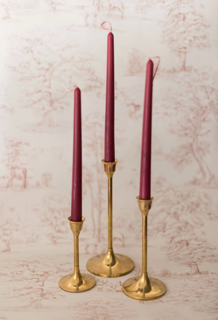 Soy and beeswax candles that fit perfectly in our brass candle holders. The florals in each candle are real flowers that have been dried and placed in the wax candle. Our standard tapered candles are a burgundy colored wax and are inlaid with pink dried flowers.