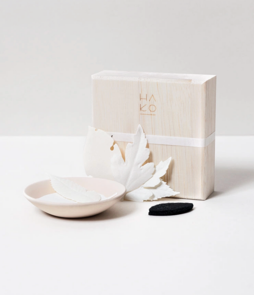 HA KO Paper Incense - Wooden Box Set of 6 With Incense Mat and Dish. A curated sampling of HA KO incense in a gift-worthy box. This special wooden box set comes with six individual leaves of HA KO Paper Incense and includes a felt mat and burning dish so you can enjoy them right away.