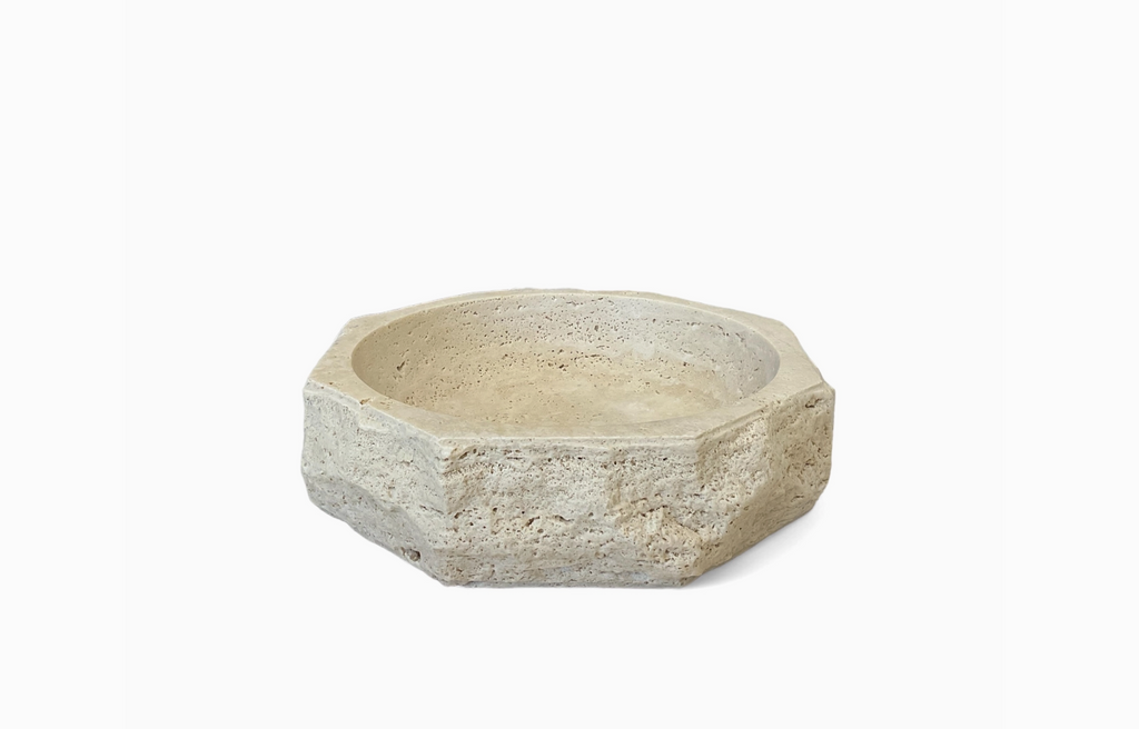The ARVEN is an exquisite octagonal bowl crafted from beige travertine, measuring 11” in width. Each piece is meticulously hand-carved, leaving the exterior surface with a natural, rugged finish that highlights the stone’s inherent beauty. This bowl seamlessly blends rustic charm with modern elegance, making it a versatile addition to any space.