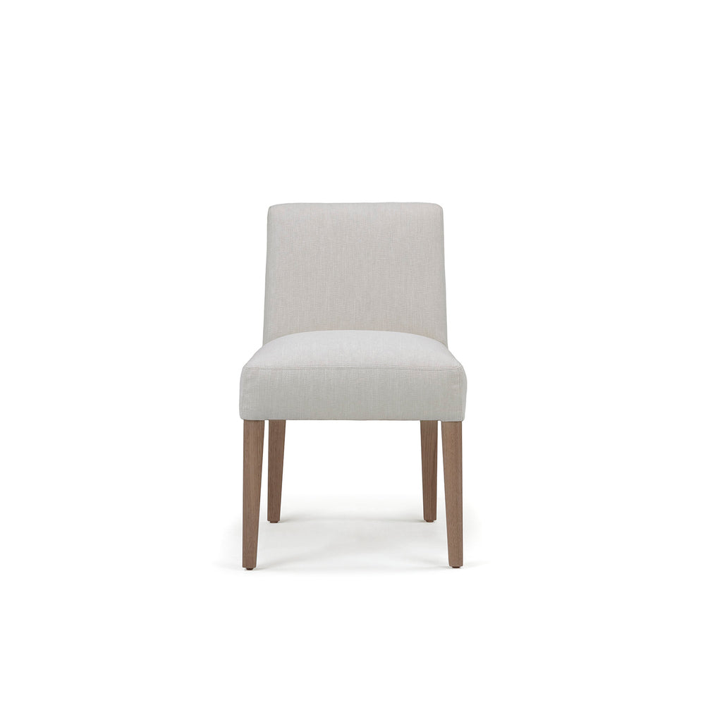 Our Thibaut Armless Dinning Chair features an exposed wood base and upholstered seat and back.