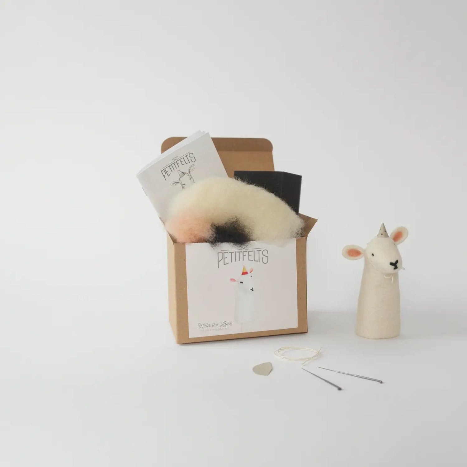 This kit includes the following: Two 38 Gauge felting needles, 1 Foam work block of white wool, a bit of black wool, a bit of pink wool, booklet with very detailed instructions alongside beautiful illustrations, a diagram in the back of the booklet to use as a guide for size and shape, string and paper (to make your lamb a party hat). The finished lamb will be approximately 5 inches tall. WARNING... Due to small parts and very sharp needles, neither this kit, nor the finished product is intended for use by small children. Needle felting is a process in which barbed needles are used to sculpt wool fiber into various forms. There is absolutely no sewing and no use of wires or armatures of any kind in this kit. The completed lamb will be solid wool.