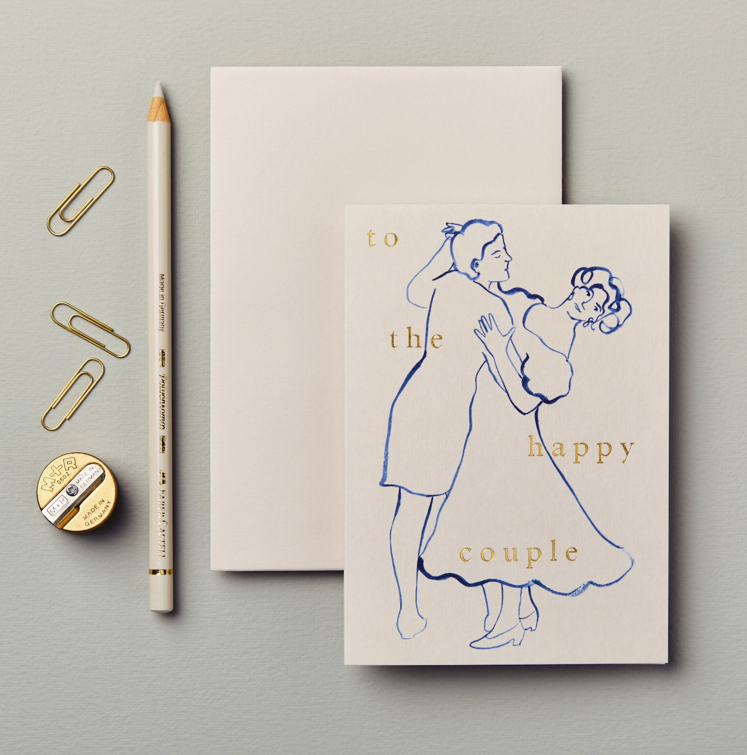 Painted blue dancers on a light grey card, adorned with a gold foil greeting which reads 'To the Happy Couple'. This card is paired with a matching grey envelope and complements our Dancers Patterned Paper.