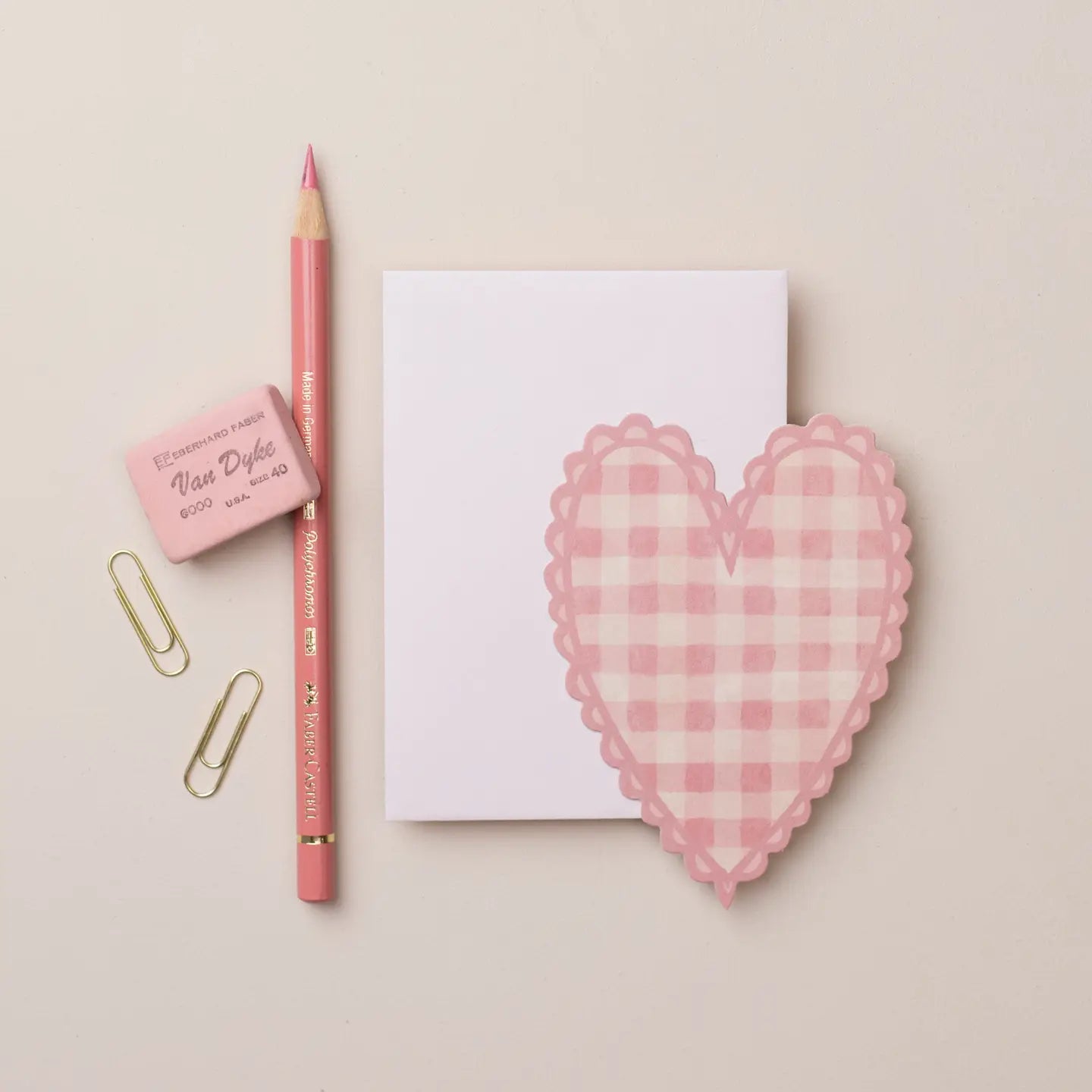 A mini die cut flat heart in a pink gingham print. Each heart is paired with a dusty pink envelope.