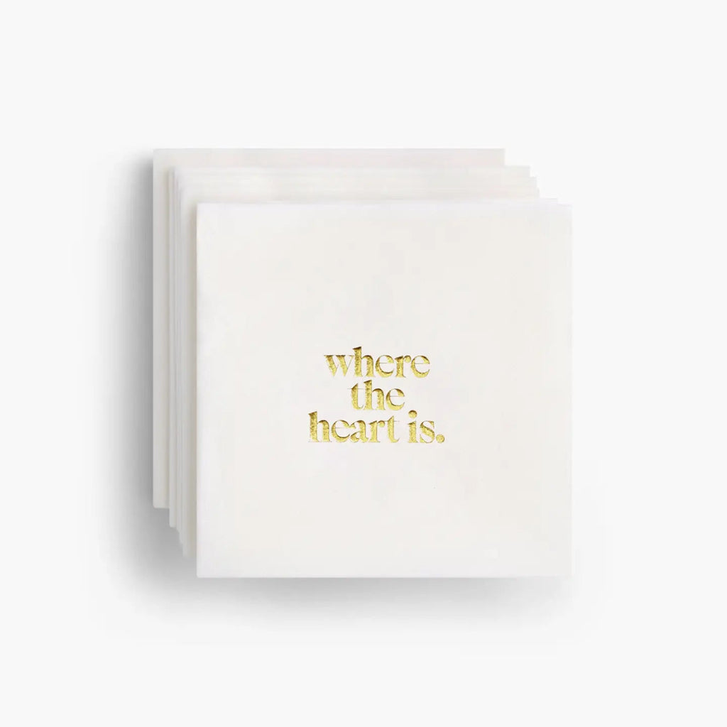 The Where the Heart Is Cocktail Napkins feature bold typography and a universal expression in debossed gold foil, adding a touch of elegance to any celebration. Made from heavyweight cotton, they are sold in crystal-clear boxed sets of 20, making them a perfect addition to your next gathering.