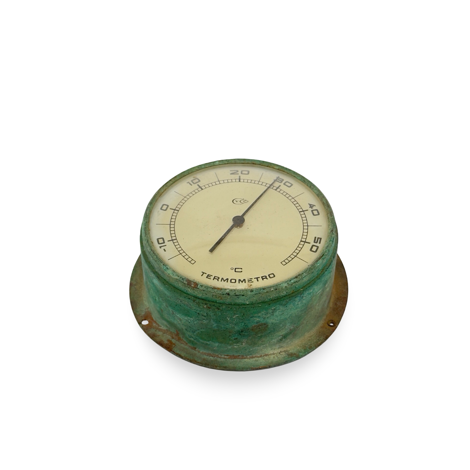 A classic round wall-mount thermometer marked “Termometro” in Spanish, with a beautiful aged green patina. Reads in degrees Celsius and adds a touch of industrial or nautical charm to any space.
