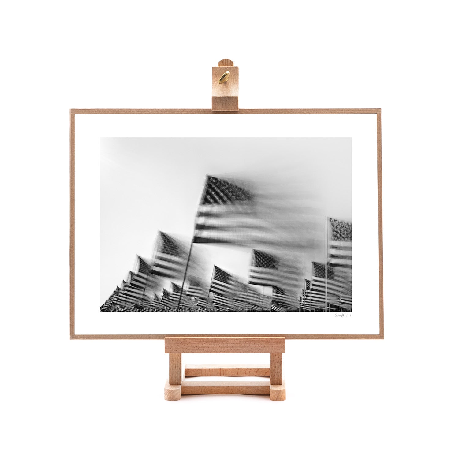 Archival pigment print behind glass with gummed kraft paper taped to heavy chipboard protected with UV conservation glass and an acid free barrier. A French framing technique makes for the perfect bookshelf or desk decoration- Easel included!