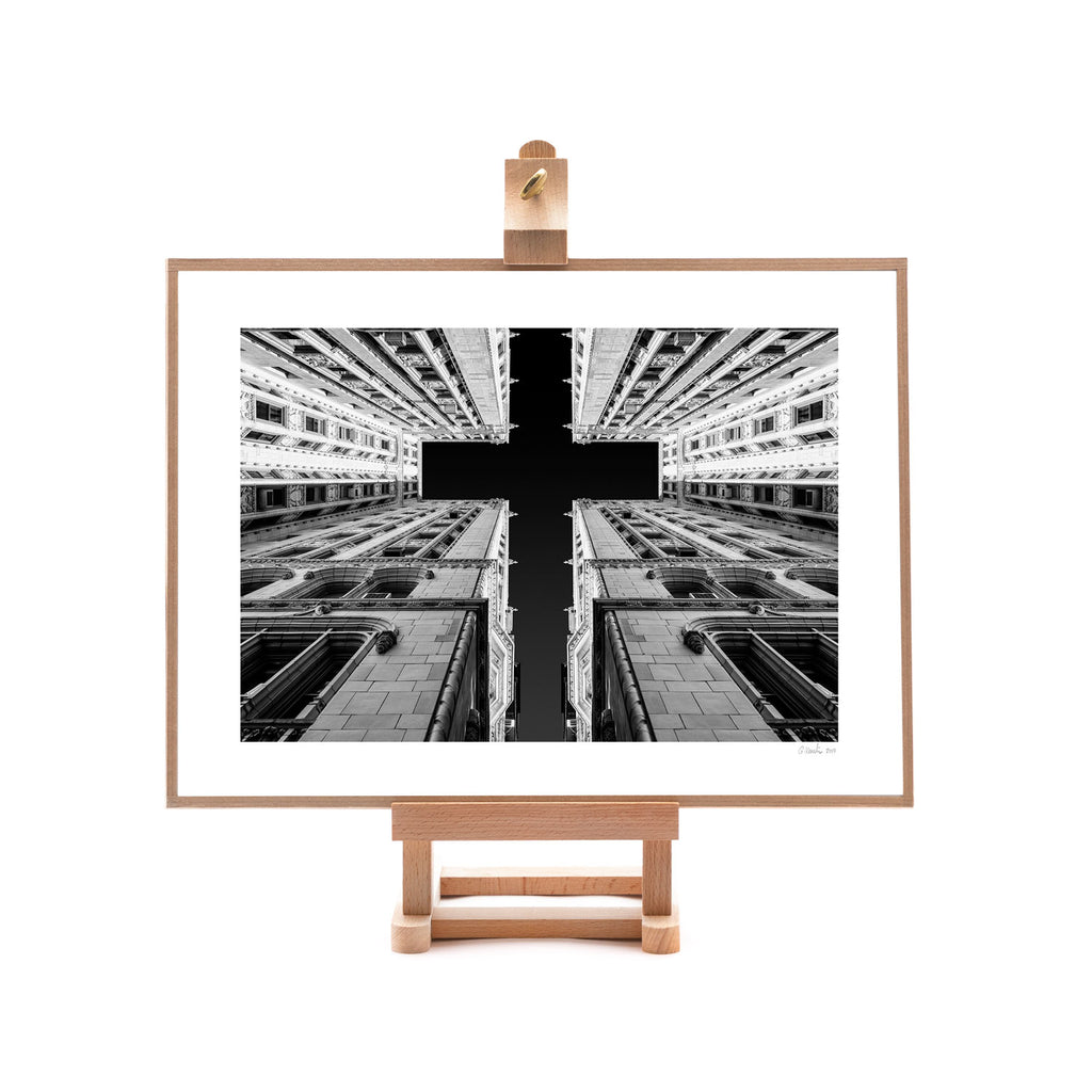 Archival pigment print behind glass with gummed kraft paper taped to heavy chipboard protected with UV conservation glass and an acid free barrier. A French framing technique makes for the perfect bookshelf or desk decoration- Easel included!