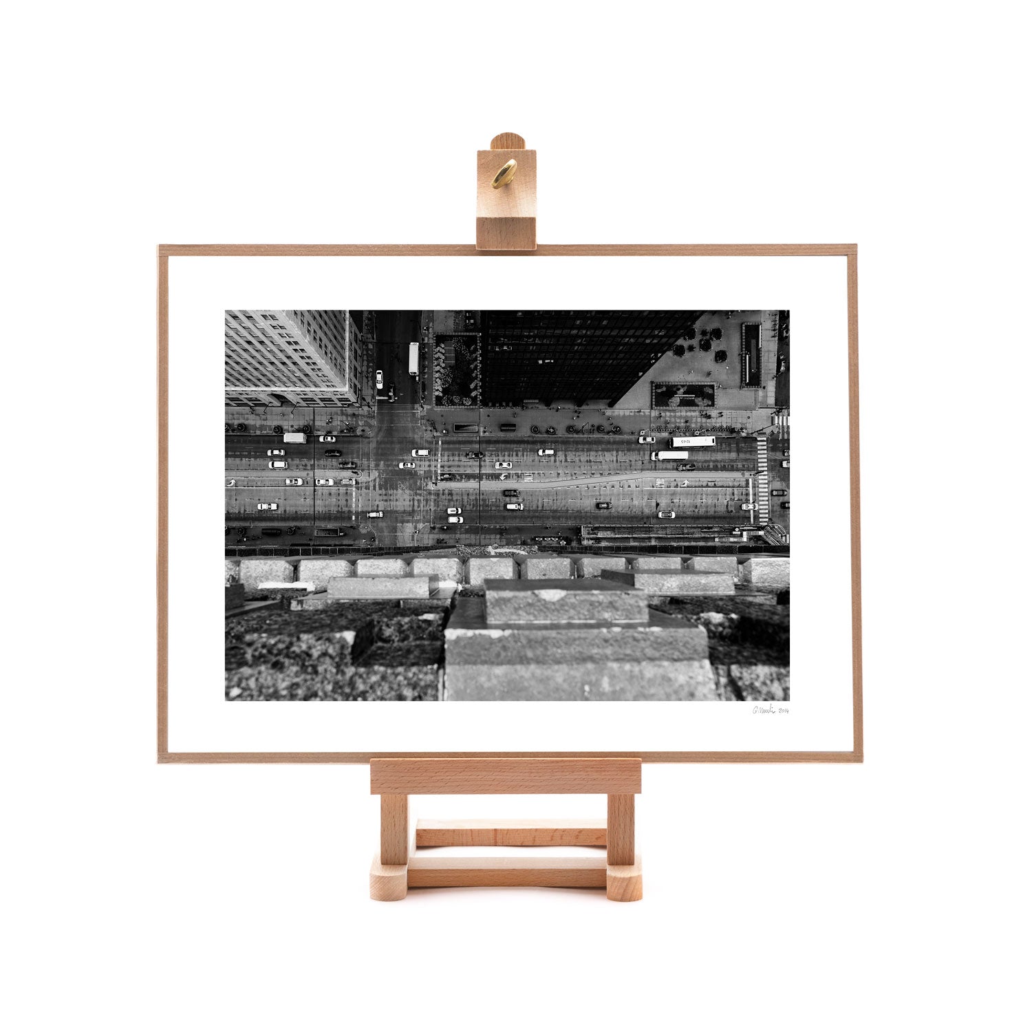 Archival pigment print behind glass with gummed kraft paper taped to heavy chipboard protected with UV conservation glass and an acid free barrier. A French framing technique makes for the perfect bookshelf or desk decoration- Easel included!