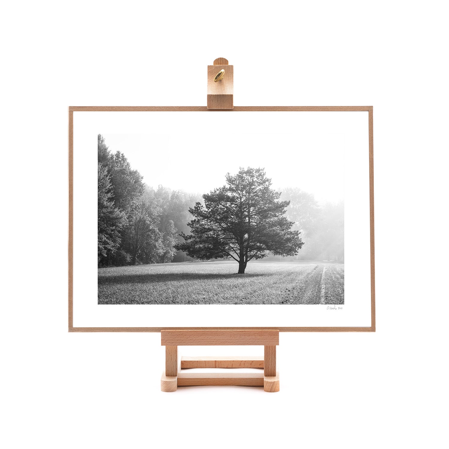Archival pigment print behind glass with gummed kraft paper taped to heavy chipboard protected with UV conservation glass and an acid free barrier. A French framing technique makes for the perfect bookshelf or desk decoration- Easel included!