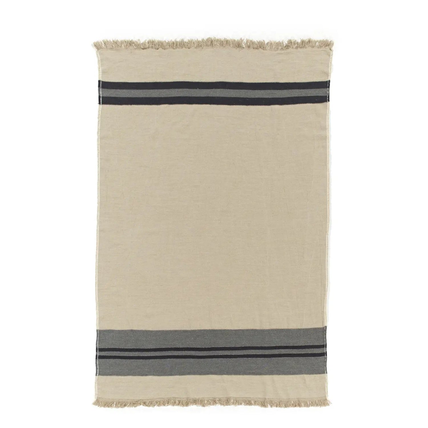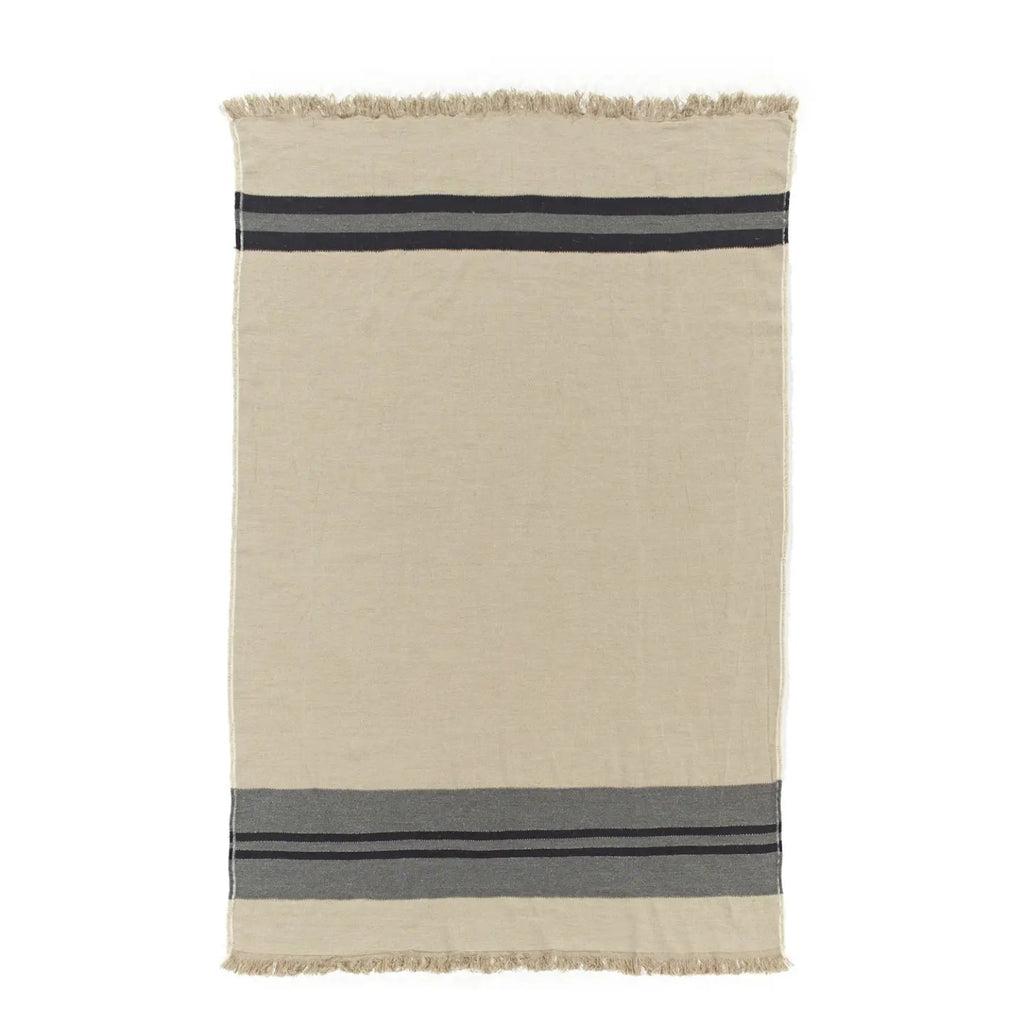 It’s a powerful yet understated kind of collection. Black & charcoal gray stripes on a flax colored ground, finished with fringe top & bottom! A classic in the making.