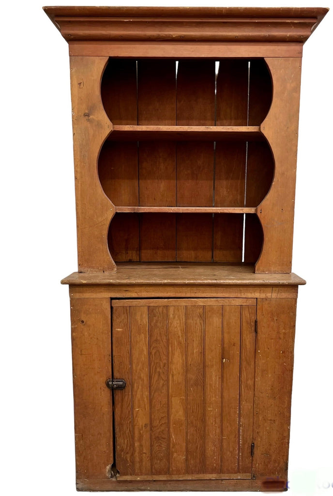 A warm and well-worn antique European pine corner cupboard with beautifully aged patina. Features open shelves with decorative cutouts above and a lower paneled cabinet for concealed storage. A functional and charming piece, ideal for adding rustic character to kitchens, dining rooms, or cozy nooks.