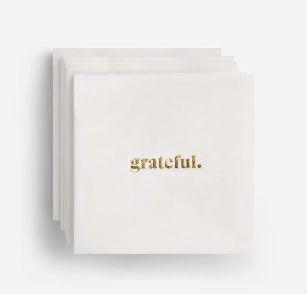Add elegance to your celebration with the Grateful Gold Foil Cocktail Napkins. Made from heavyweight cotton, these napkins feature bold typography and a universal expression in debossed gold foil, making them the perfect addition to any occasion. Sold in crystal-clear boxed sets of 20, these napkins combine luxury with practicality and are proudly made in California.