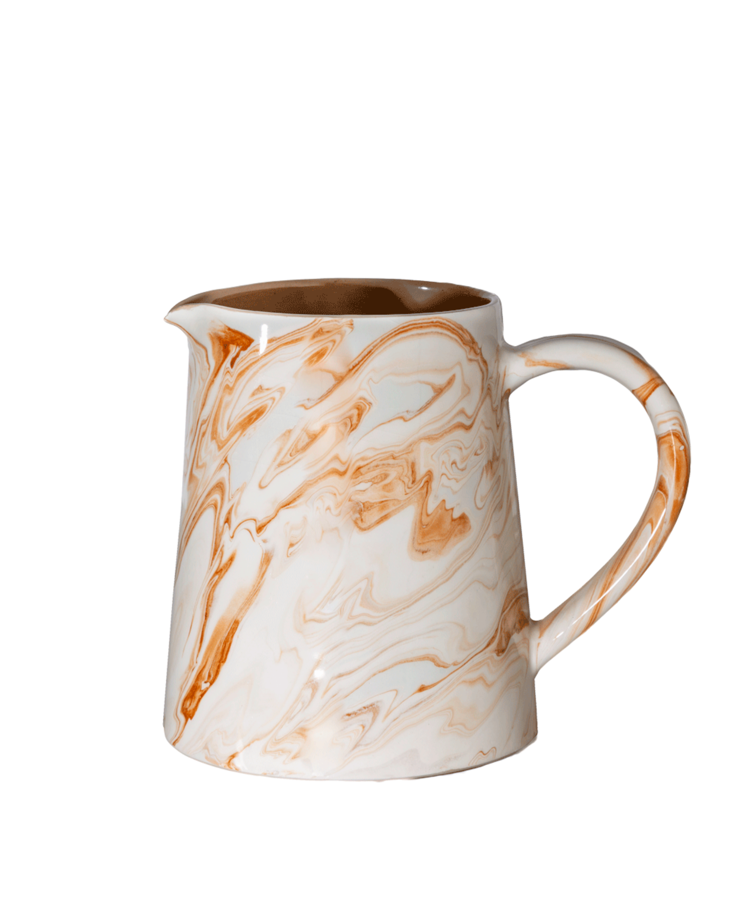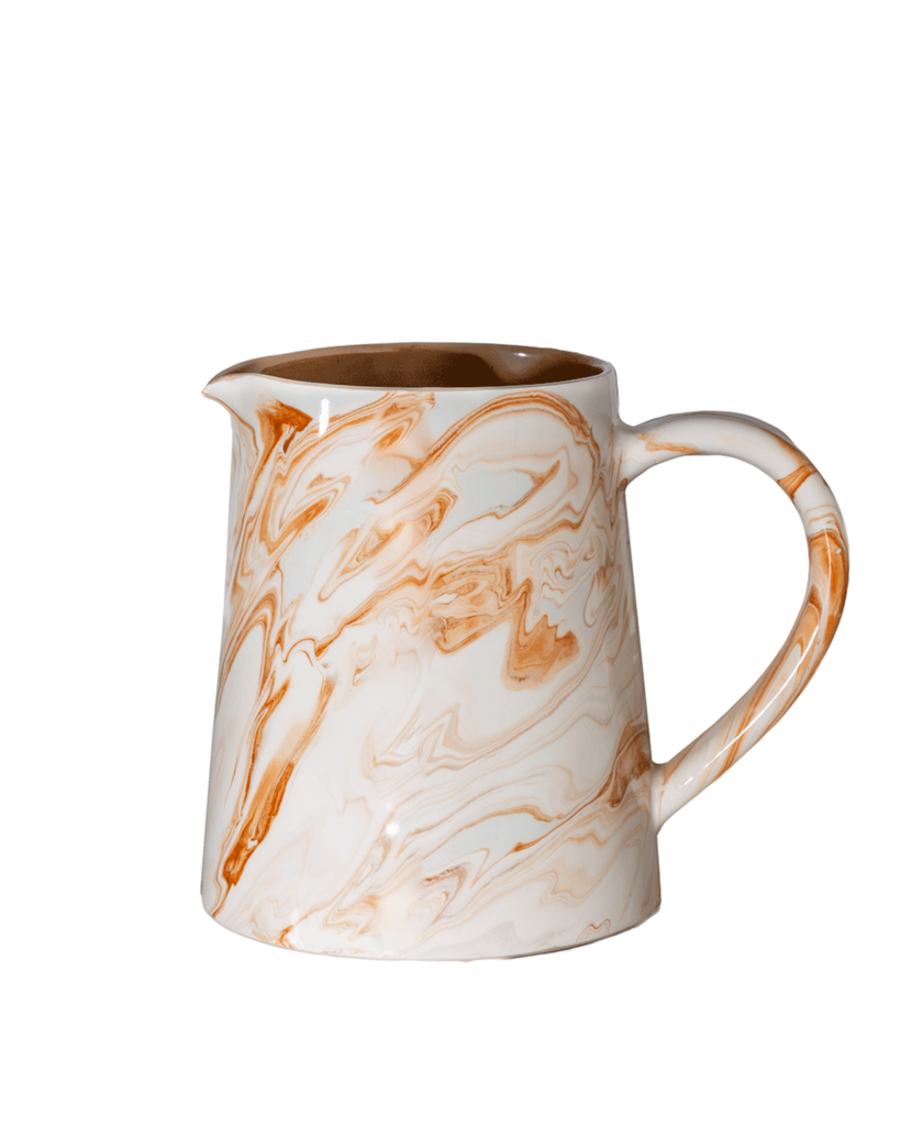 A generously sized serving pitcher with a large, open handle to make pouring easy. The straight sloped sides make this a clean, modern shape with a playful mix of color. A warm latte colored glaze interior, with marbled swirl in terracotta and cream on the outside. Subtle asymmetry and color variations highlight each pieces handmade origins.